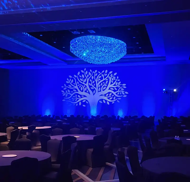 Custom gobos are an excellent branding tool, turning blank walls into a canvas for identity and style. They also offer cost-effective décor — a single gobo can create a high-end look without extensive physical installations.